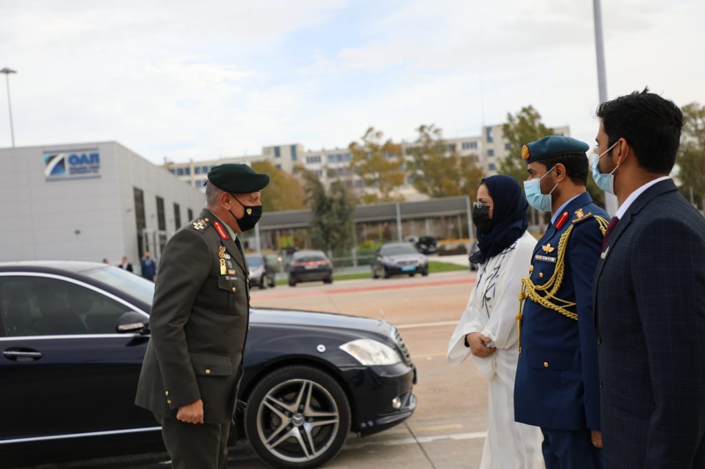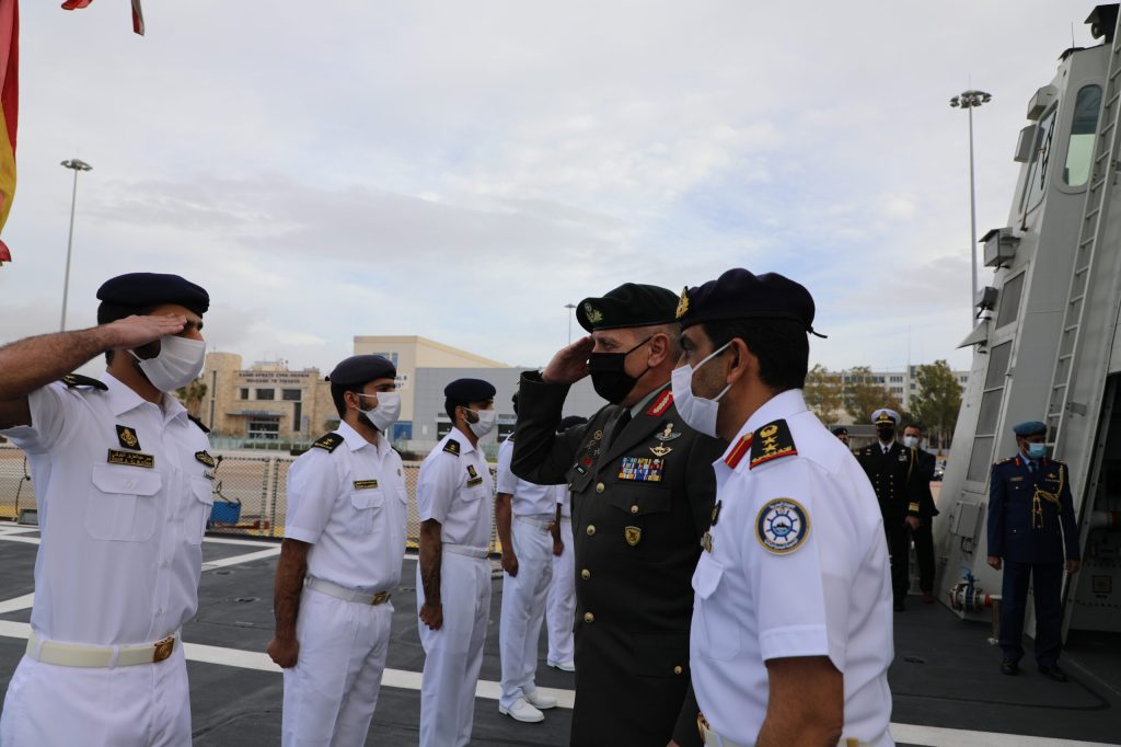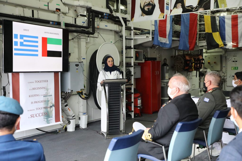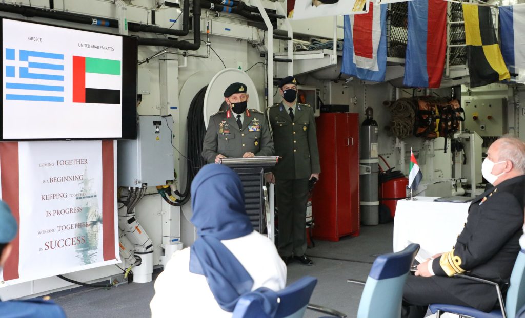 Τον Αρχηγό ΓΕΕΘΑ υποδέχτηκαν η Επιτετραμένη της Πρεσβείας των Η.Α.Ε. κα Eiman Alzeyoudi, ο Βοηθός του Ακόλουθου Άμυνας των Η.Α.Ε. Συνταγματάρχης Waleed Alharmi και ο Κυβερνήτης του πλοίου Αντιπλοίαρχος Khamis Almazrouei. Στην επίσκεψη παραβρέθηκαν ο Αρχηγός ΓΕΝ Αντιναύαρχος Στυλιανός Πετράκης ΠΝ, ο Διευθυντής του Δ΄ Κλάδου του ΓΕΕΘΑ Υποναυάρχος Φραγκίσκος Λελούδας ΠΝ και ο Διευθυντής της Διεύθυνσης Διεθνών Σχέσεων του ΓΕΕΘΑ Ταξίαρχος Νικόλαος Τριανταφύλλου, ο οποίος υπέγραψε Πρωτόκολλο Στρατιωτικής Συνεργασίας μεταξύ των δύο χωρών για το έτος 2021 (Military Cooperation Program – MCP 2021), με το οποίο εμβαθύνεται περαιτέρω η στρατιωτική συνεργασία των Ενόπλων Δυνάμεων τους μέσω της διεξαγωγής κοινών εκπαιδευτικών και επιχειρησιακών δραστηριοτήτων.
