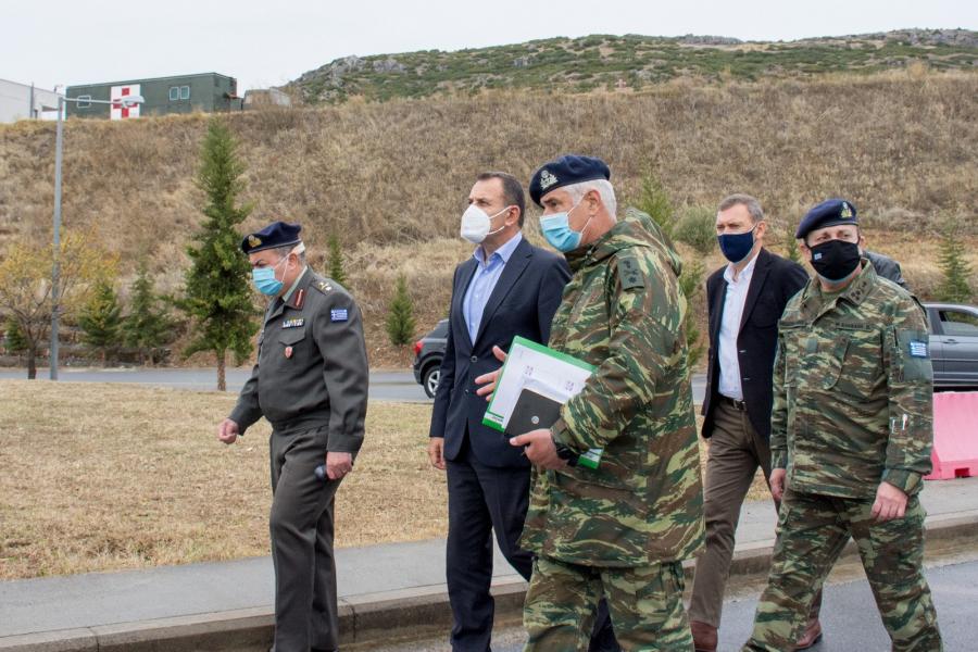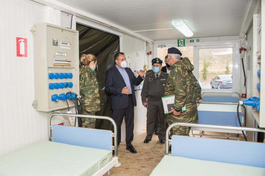 Ο Υπουργός Εθνικής Αμύνης, επίσης, επισκέφθηκε την 300 Κινητή Υγειονομική Μονάδα Αντιμετωπίσεως Εκτάκτων Αναγκών (ΚΥΜΕΑ) που έχει αναπτυχθεί στο προαύλιο του 424 ΓΝΣΕ>>.