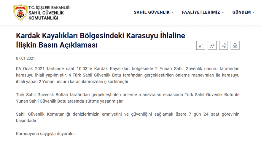 «Στις 06/01.2021στις 10:03 π.μ., πραγματοποιήθηκε παραβίαση των χωρικών υδάτων από δύο σκάφη του ελληνικού Λιμενικού Σωματος, στην περιοχή των βραχονησίδων Ίμια. Με την επέμβαση τεσσάρων ακταιωρών της τουρκικής ακτοφυλακής, απομακρύνθηκαν τα δύο ελληνικά σκάφη έξω από τα χωρικά μας ύδατα.