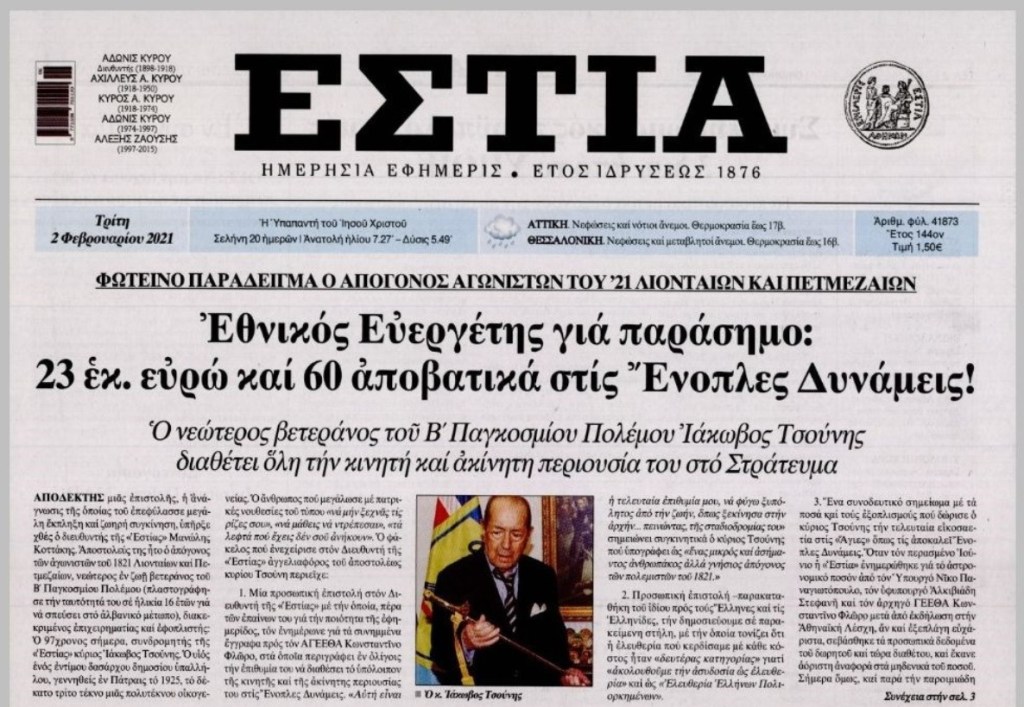 Ο Βετεράνος του Β’ Παγκοσμίου Πολέμου και απόγονος Ηρώων της επανάστασης του 1821 εφοπλιστής Ιάκωβος Τσούνης, χαρίζει την περιουσία του στις “Άγιες” όπως τις αναφέρει, Ελληνικές Ένοπλες Δυνάμεις.