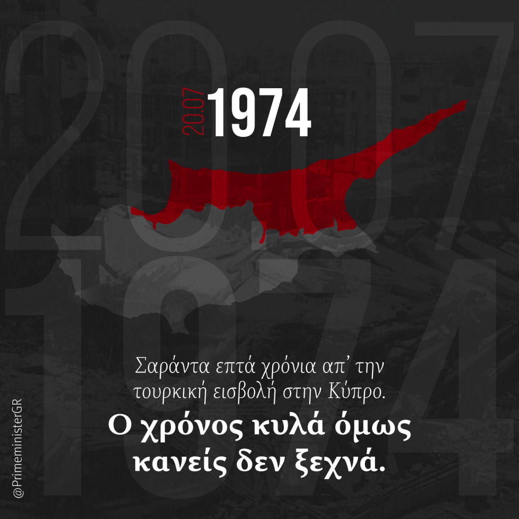 Την τουρκική εισβολή εναντίον της Κύπρου καταδίκασε ο Πρωθυπουργός σε ανάρτηση του στα μέσα κοινωνικής δικτύωσης: «Ο χρόνος κυλά όμως κανείς δεν ξεχνά. Σαράντα επτά χρόνια απ’ την τουρκική εισβολή στην Κύπρο, τα τετελεσμένα του αίματος απορρίπτονται από τον πολιτισμένο κόσμο. Και το μήνυμα μιας δίκαιης λύσης, με το νησί ενωμένο και χωρίς στρατό κατοχής, παραμένει ισχυρό, ανθεκτικό και απόλυτα ενεργό.