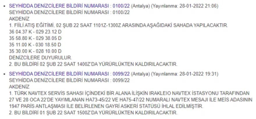 Ο υδρογραφικός σταθμός της Αττάλειας της Τουρκίας εξέδωσε Navtex λίγο μετά την ανακοίνωση του ελληνικού Πολεμικού Ναυτικού για ασκήσεις στην Ανατολική Μεσόγειο.