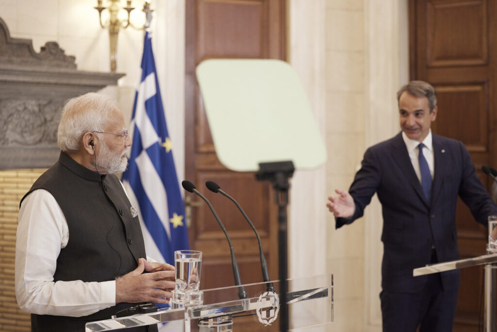 (Ξένη Δημοσίευση) Ο πρωθυπουργός Κυριάκος Μητσοτάκης (Δ) με τον πρωθυπουργό της Ινδίας Ναρέντρα Μόντι (Α), κάνουν κοινές δηλώσεις μετά τη συνάντησή τους, στο Μέγαρο Μαξίμου, Αθήνα, Παρασκευή 25 Αυγούστου 2023. O πρωθυπουργός της Ινδίας, Narendra Modi πραγματοποιεί επίσημη επίσκεψη στην Αθήνα, η πρώτη επίσκεψη Ινδού πρωθυπουργού στην Ελλάδα τα τελευταία 40 χρόνια, από το 1983, όταν επισκέφθηκε τη χώρα μας η Ίντιρα Γκάντι. ΑΠΕ-ΜΠΕ/ΓΡΑΦΕΙΟ ΤΥΠΟΥ ΠΡΩΘΥΠΟΥΡΓΟΥ/ΔΗΜΗΤΡΗΣ ΠΑΠΑΜΗΤΣΟΣ