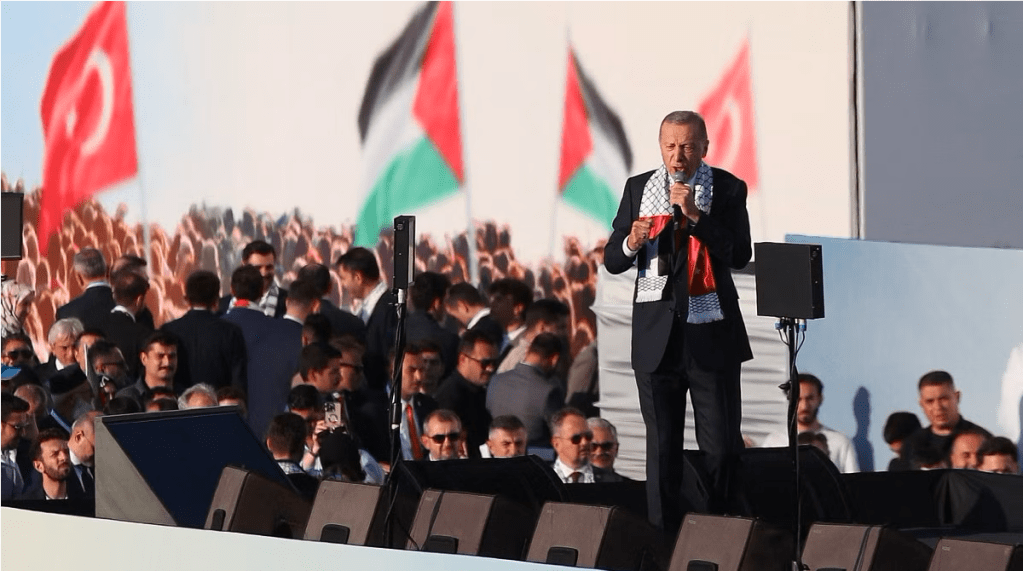 Στη συγκέντρωση, ο Ερντογάν χαρακτήρισε τις δυτικές δυνάμεις «τον κύριο ένοχο» πίσω από τη «σφαγή» των Παλαιστινίων στη Γάζα από τον ισραηλινό στρατό.