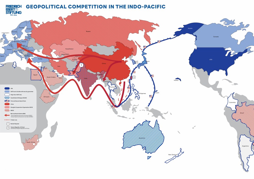 Η Κίνα δυσφορεί με την αμερικανική παρουσία στον Ινδοειρηνικό που το Πεκίνο θεωρεί ότι ανήκει δικαιωματικά στη δική του σφαίρα επιρροής και φοβάται για την ασφάλεια του εμπορίου και των επικοινωνιών της. Η απάντηση του Πεκίνου έρχεται με την ισχυρή στρατιωτική παρουσία στη θάλασσα της Νότιας Κίνας, τις πιέσεις προς την Ταιβάν και την οδό Belt and Road και τις παράπλευρες οδούς της, με στόχο την ευρωπαϊκή αγορά.